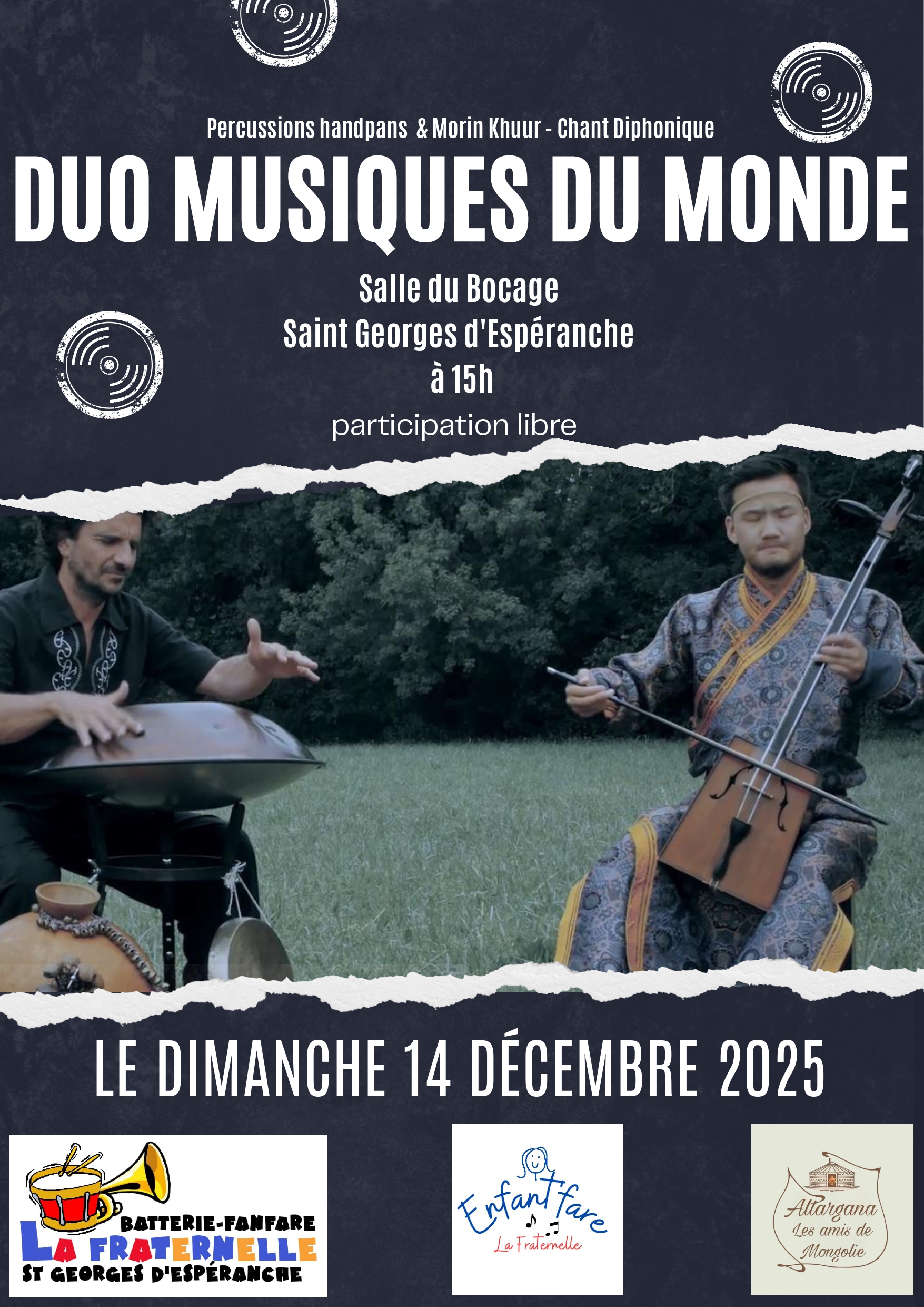 Au bocage à St Georges (juste après l’église), venez écouter un concert de musique, Avec la Fraternelle, Enfant-fare et Altargana les amis de Mongolie