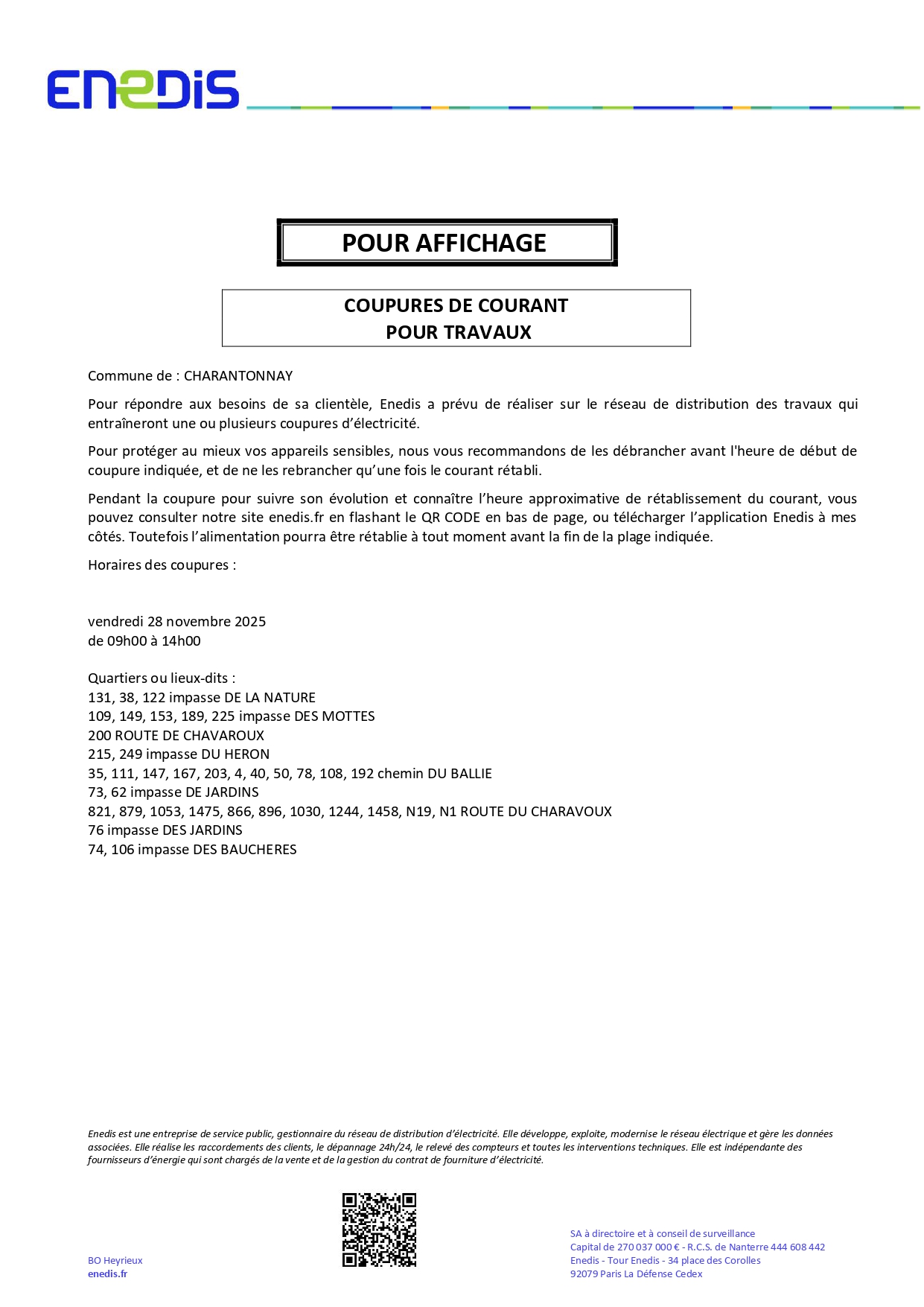 Une ou plusieurs coupureseront réalisées VENDREDI 28 NOVEMBRE entre 9h ET 14h selont le courrier de ENEDIS ci-dessous :